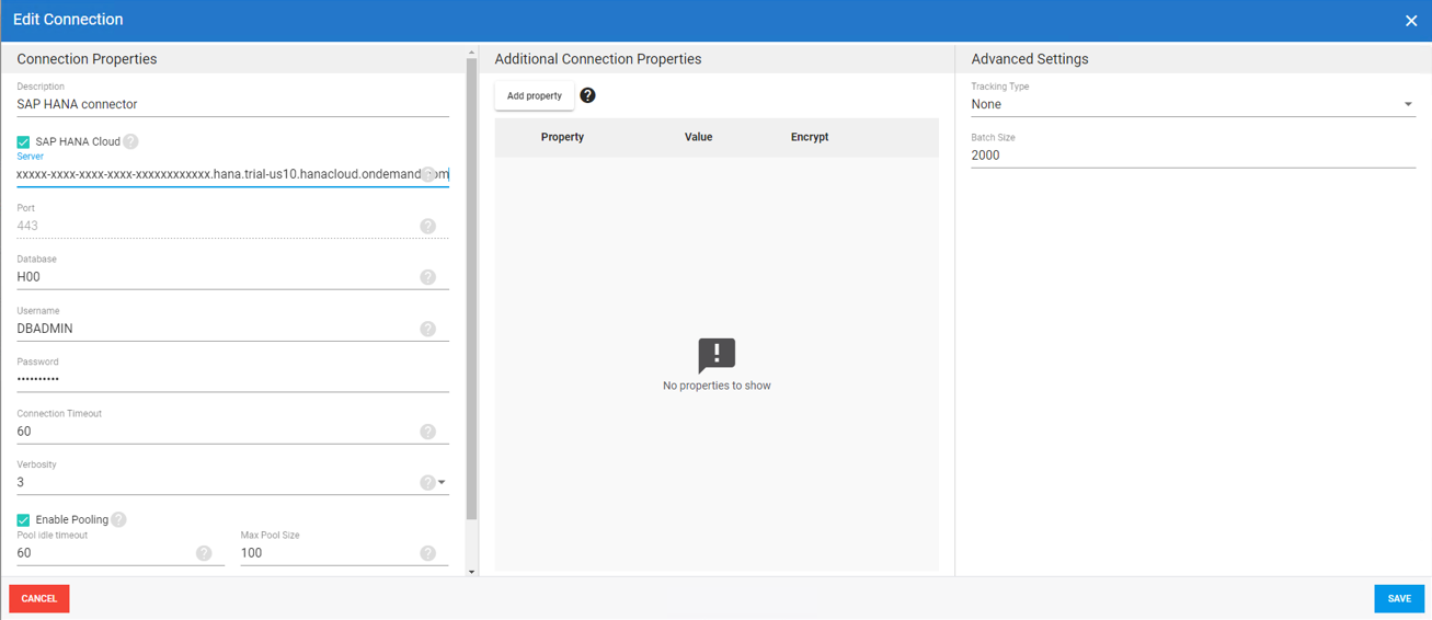 Copy and paste the Host value from the SAP HANA Database Explorer. The Server name has the following format: xxxxxxxx-xxxx-xxxx-xxxx-xxxxxxxxxxxx.hana.trial-us10.hanacloud.ondemand.com where xxx are alphanumeric values. |