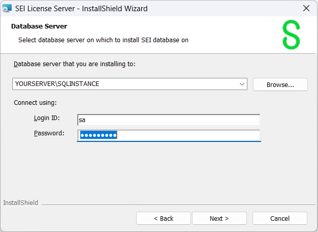 In the Database Server screen, enter the Administrator credentials of the database server.