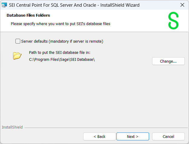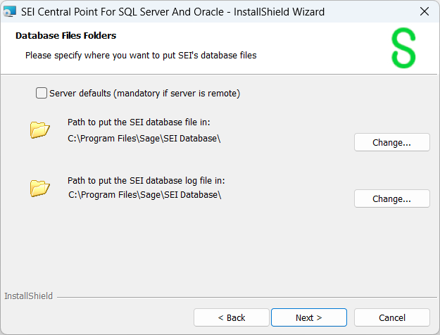 Select the Server Defaults option so that the database server can load the files in its default location, OR click Change... to choose the appropriate location.