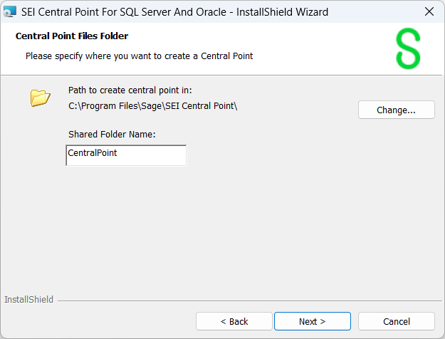 To install the SEI Central Point for SQL Server and Oracle, use the SEI Central Point For SQL Server and Oracle.exe installation package on the server in which the Central Point folder (repository) should be located.