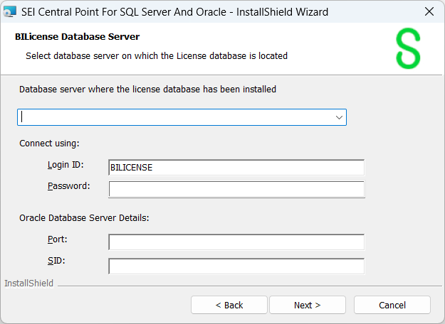 In the BILicense Database Server screen, indicate the SQL Database Server where the SEI BILicense database has already been installed, and provide the required credentials for logging onto this server. Click Next.