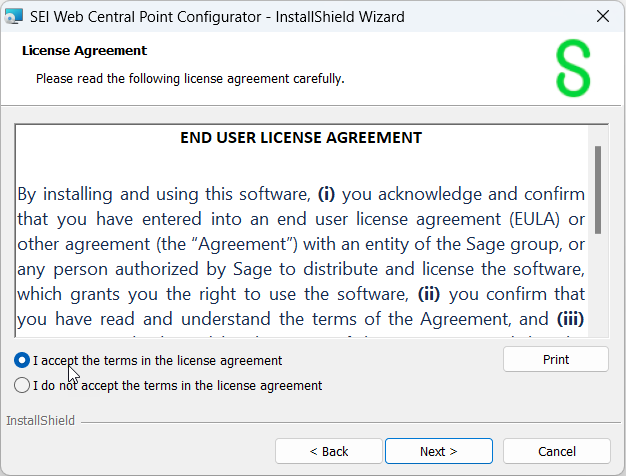 1. Run the application SEI Web Central Point Configurator.exe and click Next.