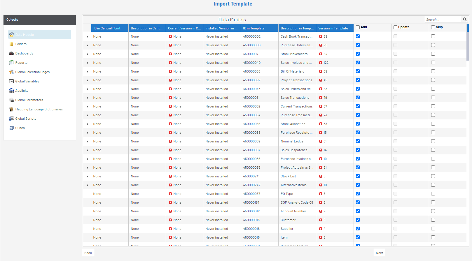 In the next screen, all of the Templates content is displayed, against what the Central Point already has. By default, on the first install, everything will be set to Add (leave everything by default) .
