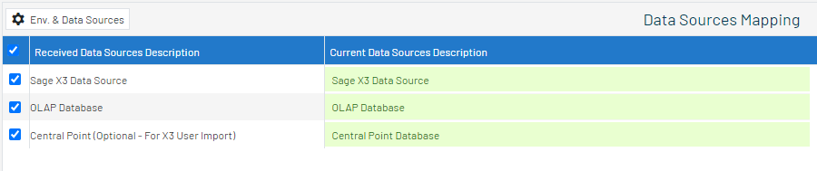 3. In the Data Sources Mapping screen, associate the data sources (ERP) listed in the Received Data Sources Description column (those from the template) with the data sources you previously defined in the Central Point (listed in the Current Data Sources Description column).