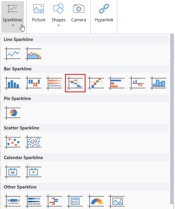 Click Sparkline and select the cascade sparkline under Bar Sparkline from the list.