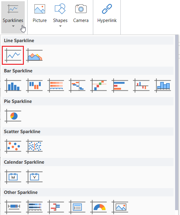 Click Sparkline and select the line sparkline under Line Sparkline from the list.