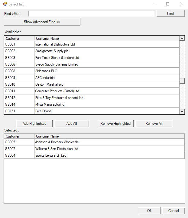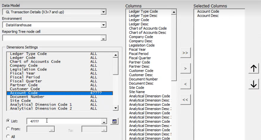 Guide de sélection à côté du champ Liste pour sélectionner une plage de valeurs associée à la Dimension dans le Guide de sélection. Dans la fenêtre Sélectionner liste qui apparaît, vous pouvez sélectionner les valeurs que vous voulez inclure (ou exclure) dans la liste Disponible (en haut) et utiliser le bouton Ajouter surligné pour les ajouter à la liste sélectionnée (ci-dessous). Vous pouvez également Ajouter tout, Supprimer tout ou supprimer certaines valeurs de la section Liste sélectionnée (Supprimer surligné). -