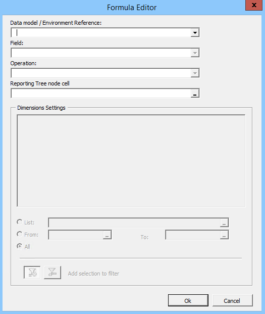 Assistant Formule dans l'onglet Compléments pour ouvrir l'éditeur de formule. - Sélectionnez la Référence correspondant au Modèle de données et à l'Environnement que vous souhaitez utiliser pour accéder aux données dont vous avez besoin.