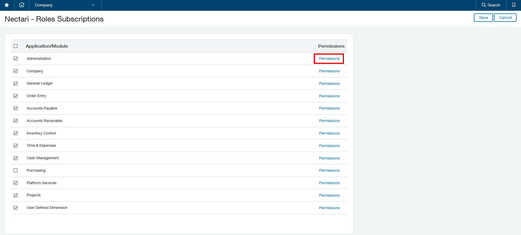 Dans la page Roles Subscription, cochez la case Application / Module et cliquez sur l'hyperlien Permissions.