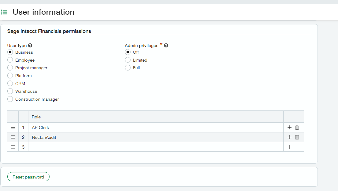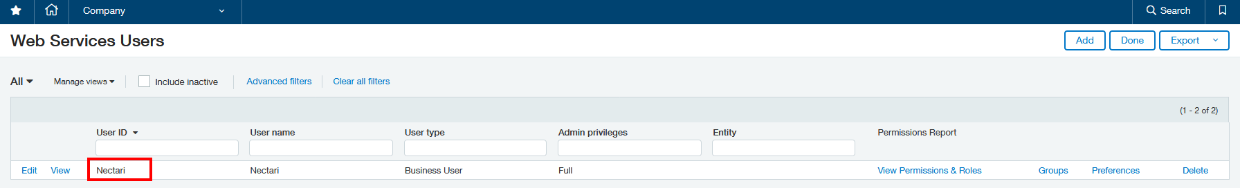 Nectari nécessite la création d'un utilisateur de service Web pour récupérer les données de l'API Sage Intacct. Cet utilisateur doit avoir un accès en lecture seule à tous les modules Intacct ainsi qu'à la table d'audit des enregistrements supprimés dans Intacct.