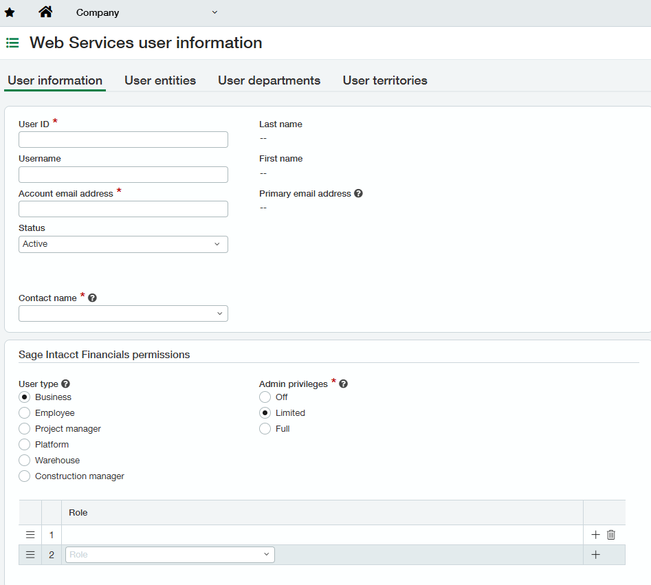 Veuillez noter que la fonctionnalité des services Web configurée dans Sage Intacct nécessite une licence d'utilisateur Web pour l'accès externe. Par conséquent, une licence d'utilisateur Web doit être obtenue auprès d'Intacct pour la mise en œuvre avec SEI.