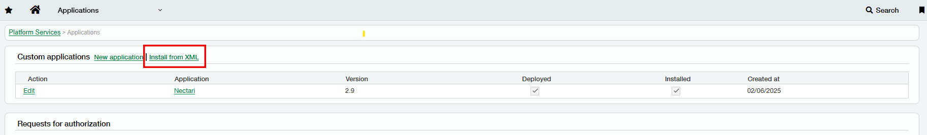 Depuis Platform Services, allez dans Applications et sélectionnez Install from XML : Nectari_ProcessDelete.xml. Ce fichier est disponibles dans ShareFile.