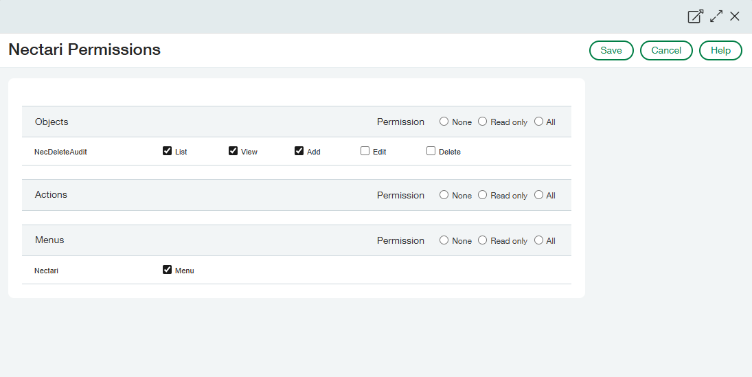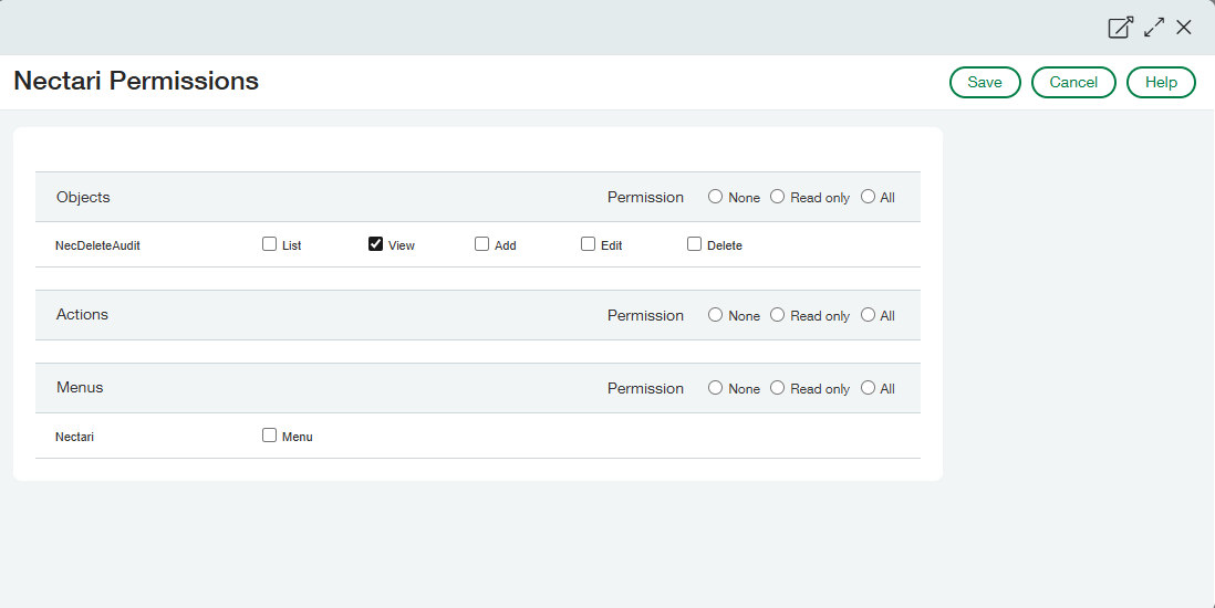 Le rôle — Nectari a besoin de la permission pour l'objet NecDeleteAudit. Cliquez sur la case à cocher View.