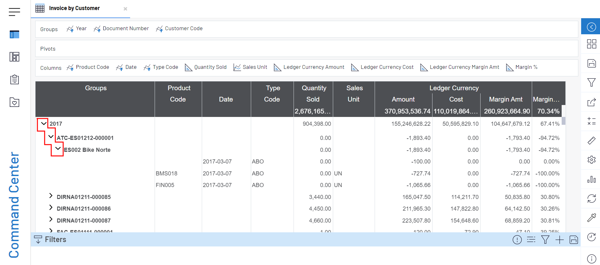 Use the + and – buttons in the left margin to expand or collapse group levels.