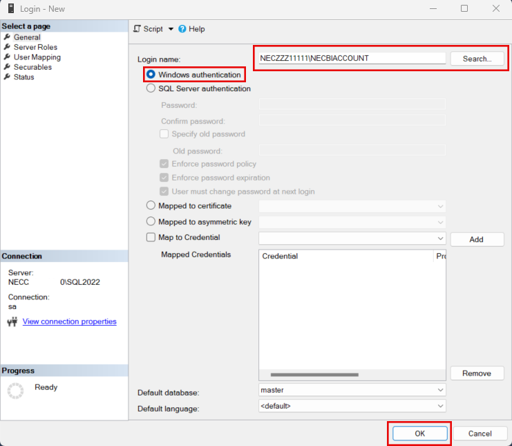 Si vous voulez éviter d'utiliser l'utilisateur sa pour vous connecter aux bases de données, vous pouvez créer un fichier de type SQL Server Login pour SEI :