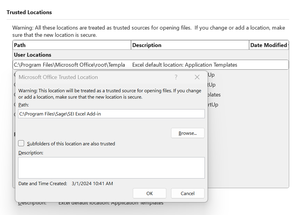 7. Entrez le chemin d'installation C:\Program Files\Sage\SEI Excel Add-in et cliquez sur OK 3 fois pour terminer la procédure d'installation.