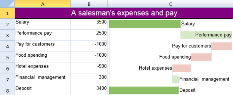 There are different use case scenarios for Cascade sparkline parameters used in the CASCADESPARKLINE formula. For example: =CASCADESPARKLINE(pointsRange, pointIndex, labelsRange, minimum, maximum, colorPositive, colorNegative, vertical) =CASCADESPARKLINE(pointsRange, pointIndex, labelsRange, minimum, maximum, colorPositive, colorNegative, vertical, itemTypeRange, colorTotal) |