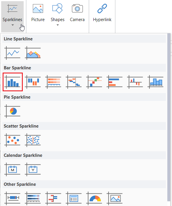 Click Sparkline and select the column sparkline under Bar Sparkline from the list.