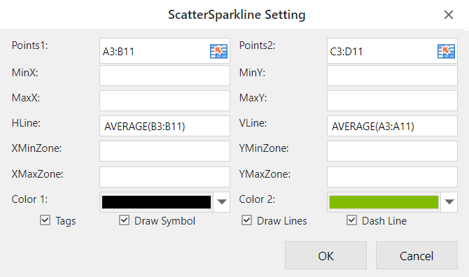 The scatter sparkline formula has the following syntax: =SCATTERSPARKLINE(points1, points2, minX, maxX, minY, maxY, hLine, vLine, xMinZone, xMaxZone, yMinZone, yMaxZone, tags, drawSymbol, drawLines, color1, color2, dash) |