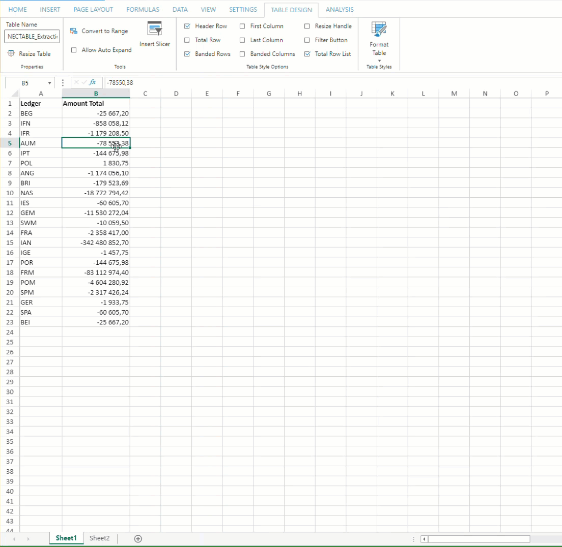 The output of the data extraction is a table control which gives you the flexibility of formatting the header, total row and the row and even adding additional columns. All of the customization to the extraction will continue to work even after refreshing. It is also possible to use the Drill Down Wizard on a data extraction to get more specific information about the formulas in the extraction.