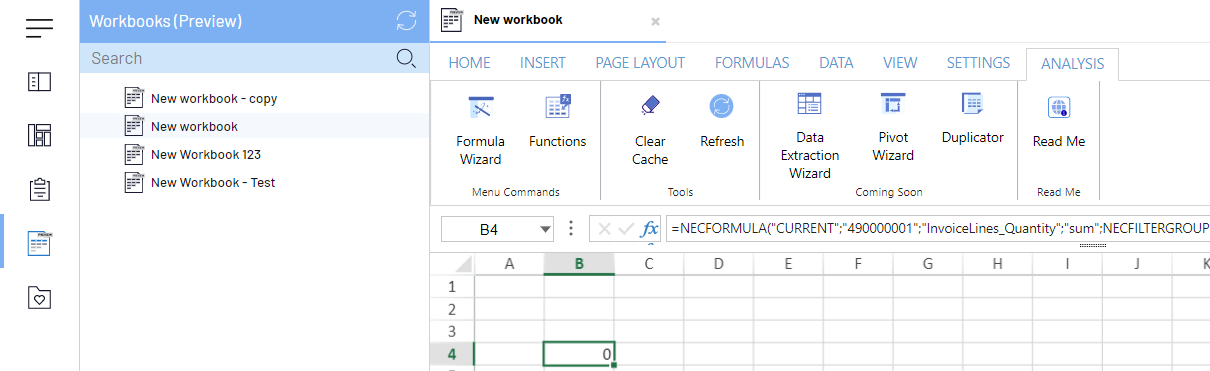 The Workbooks tab allows you to manage workbooks in the Web Interface directly instead of using the Excel Add-in. You can utilize all of the regular Excel features within the workbook as well as the Excel Add-in features. Excel formulas are additionally supported in French or Spanish based off the chosen interface language.