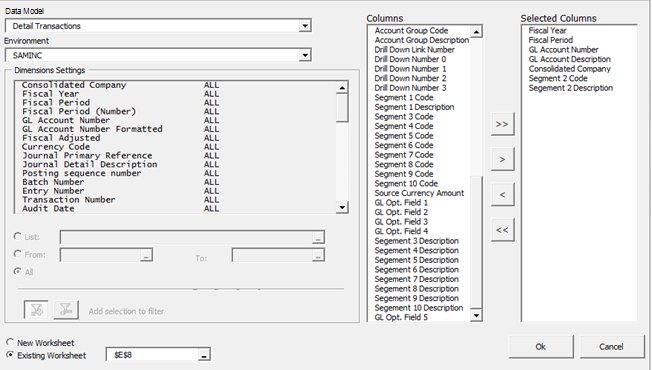 - In the SEI Pivot Table Editor window that appears, choose the SEI Data Model, the Environment and enter the Dimension Settings to filter the resulting data (the same way as for a SEI Formula, refer to Formula for more details).
