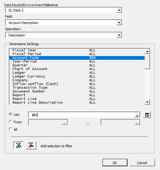 - Spécifiez lesParamètres de Dimension en sélectionnant la Dimension dans la liste des dimensions pour qu'elle soit surlignée, puis en choisissant l'une des trois options de filtrage disponibles sous la section Liste. Note