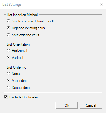 - Pour retourner la liste des valeurs du champ sélectionné. La sortie est une cellule délimitée par des virgules triées par ordre croissant. La différence avec l'autre option de liste est que cette liste sera mise à jour comme n'importe quelle formule Excel lorsque les paramètres sont modifiés.