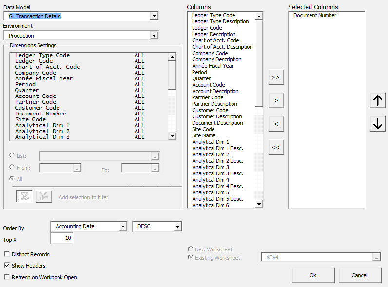 Par exemple, dressez la liste des Comptes et des Descriptions de Comptes pour la Balance de Vérification. Cette liste est automatiquement actualisée lorsqu'un nouveau compte est créé dans l'ERP.