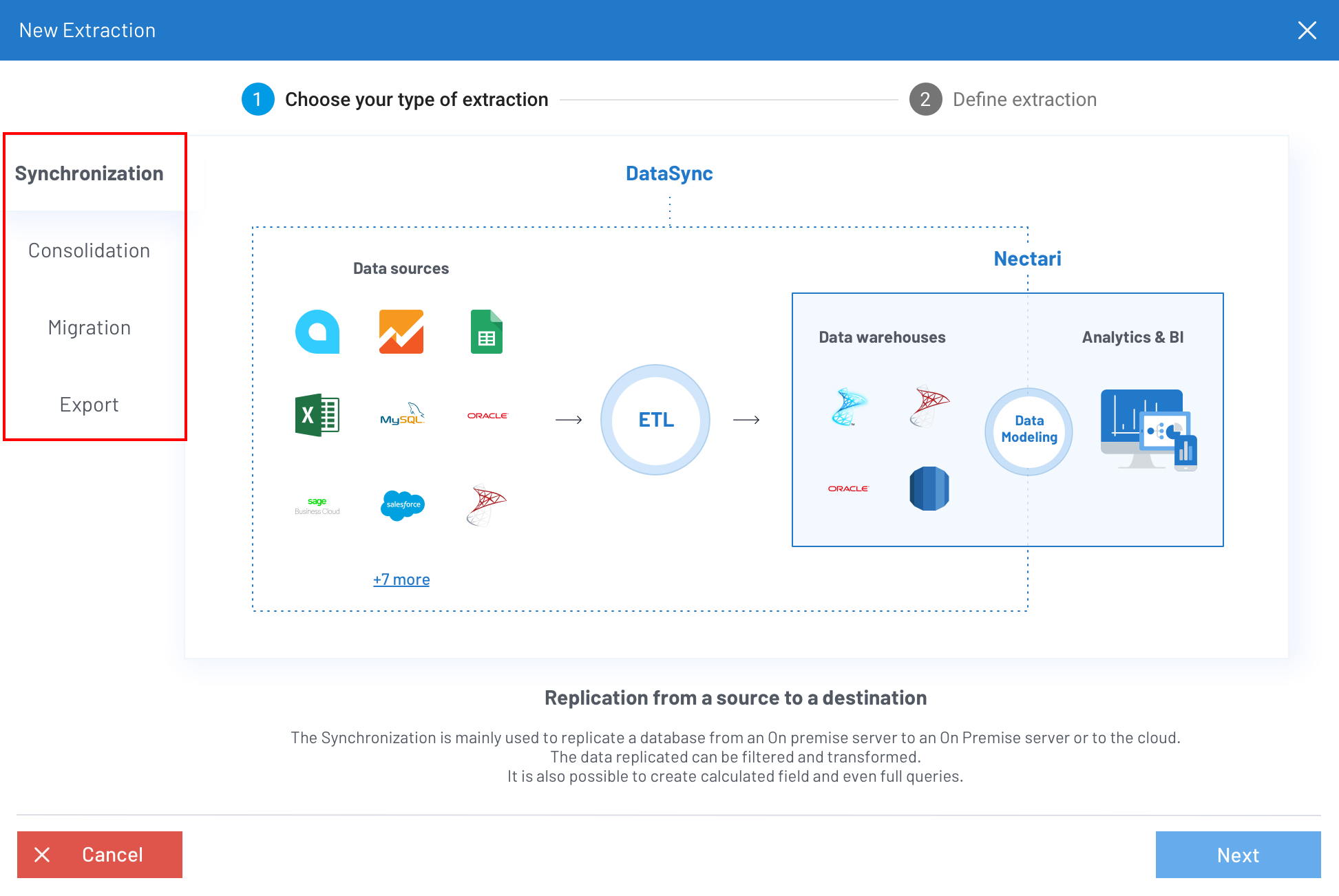 - Synchronization: consists of replicating tables from a source connection to the tables of a destination connection.