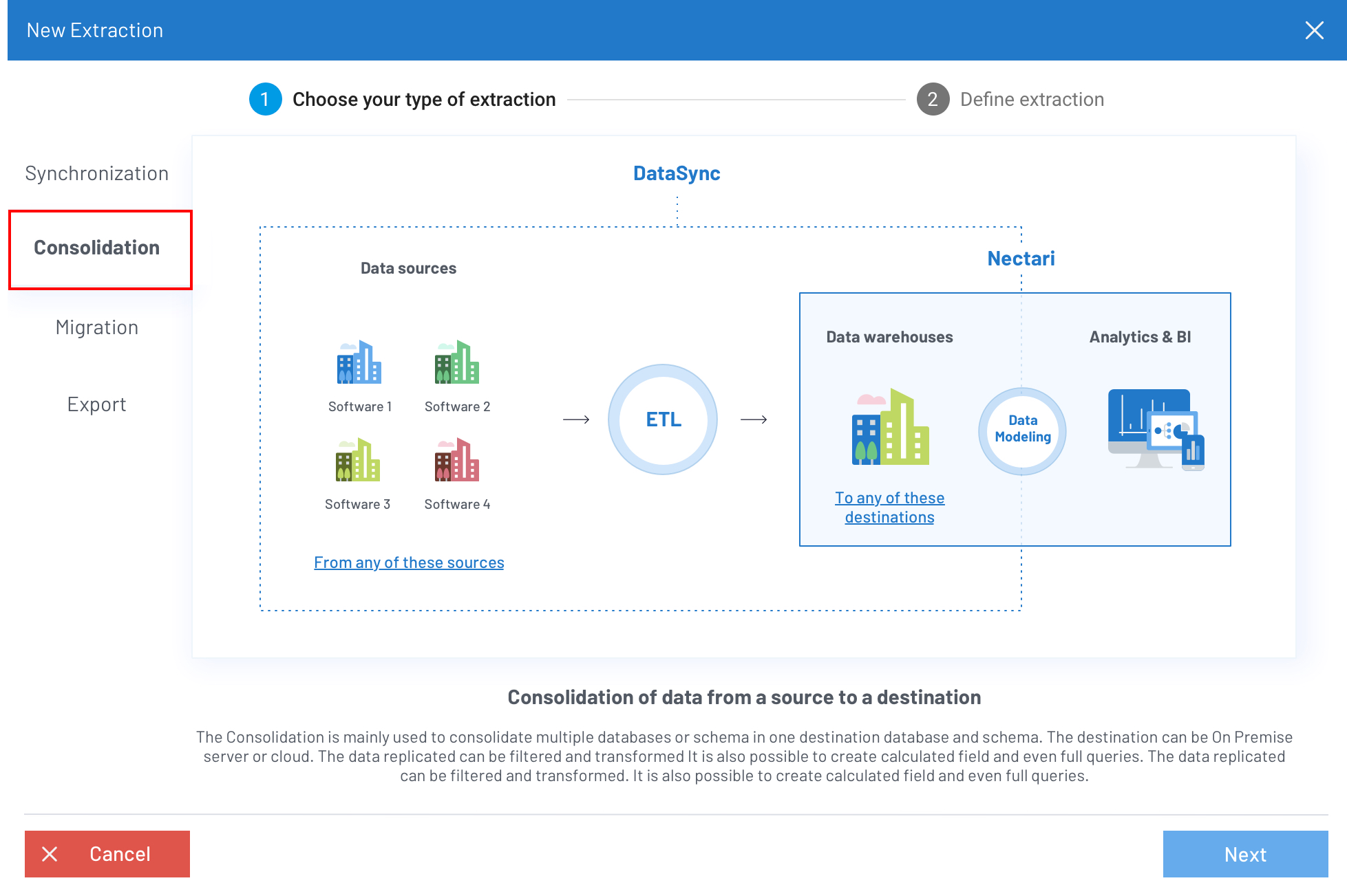 - Consolidation: consists of merging multiple sources into one destination (a license is required to get access to this feature).