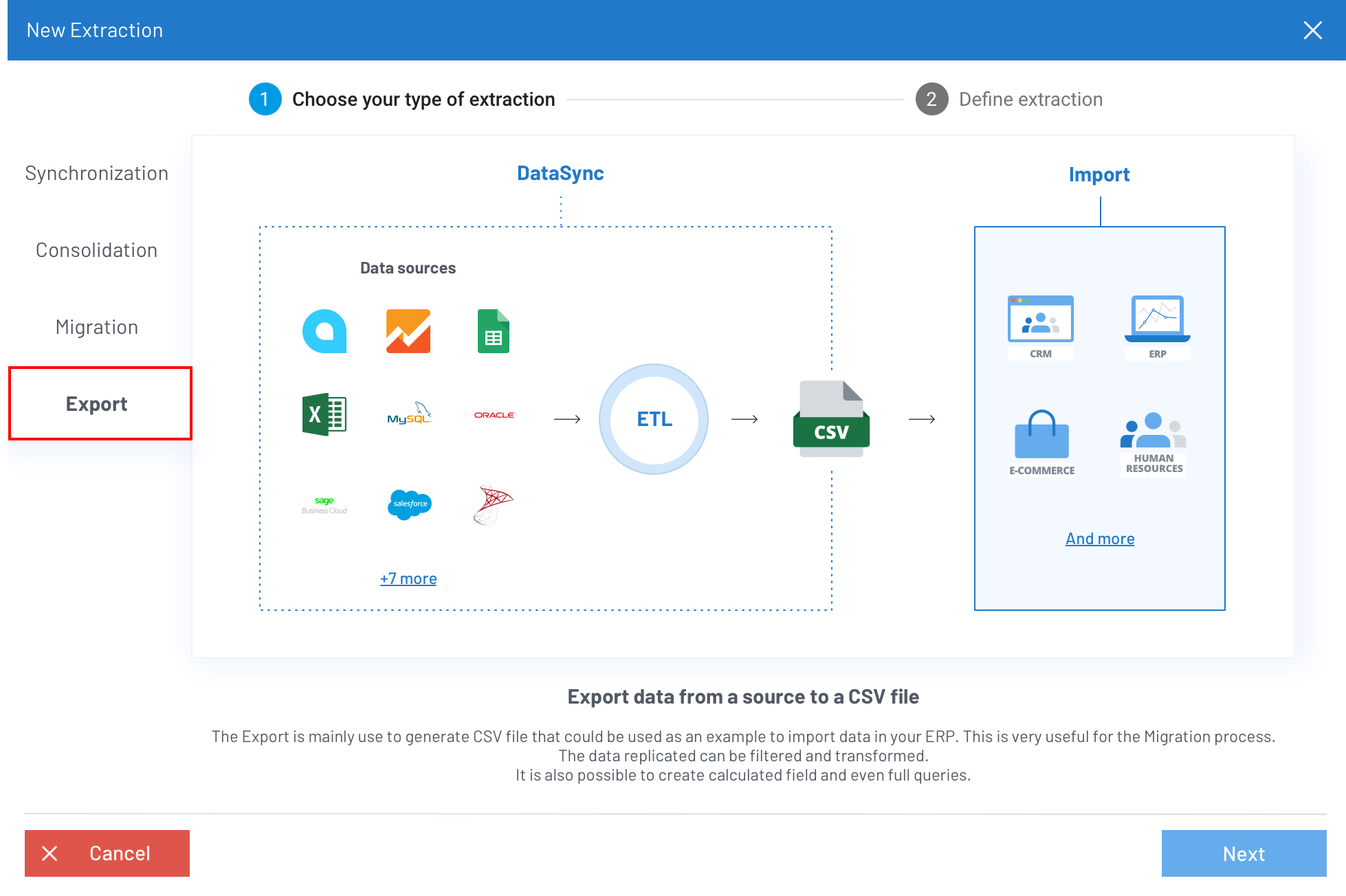 - If you select Export, a CSV file will be generated and its name will be the name of the destination table. By default the name of the destination table is the same as the source but it can be overwritten in the table section. Generally this file will be imported with the Import feature that usually exists in each different systems such as ERP or CRM softwares. These Import features use their own business logic to validate the data and are often used to create all the common data required to setup initially the system during the implementation process such as the Customers, Products, Gl Account, Gl Balances, etc.
