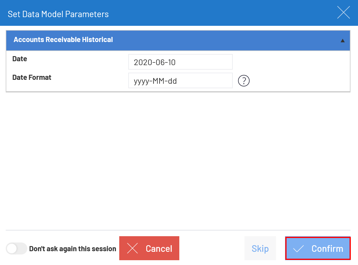- Dans la fenêtre Définition des Paramètres du Modèle de Données, ajustez le champ Date et cliquez sur Confirmer.