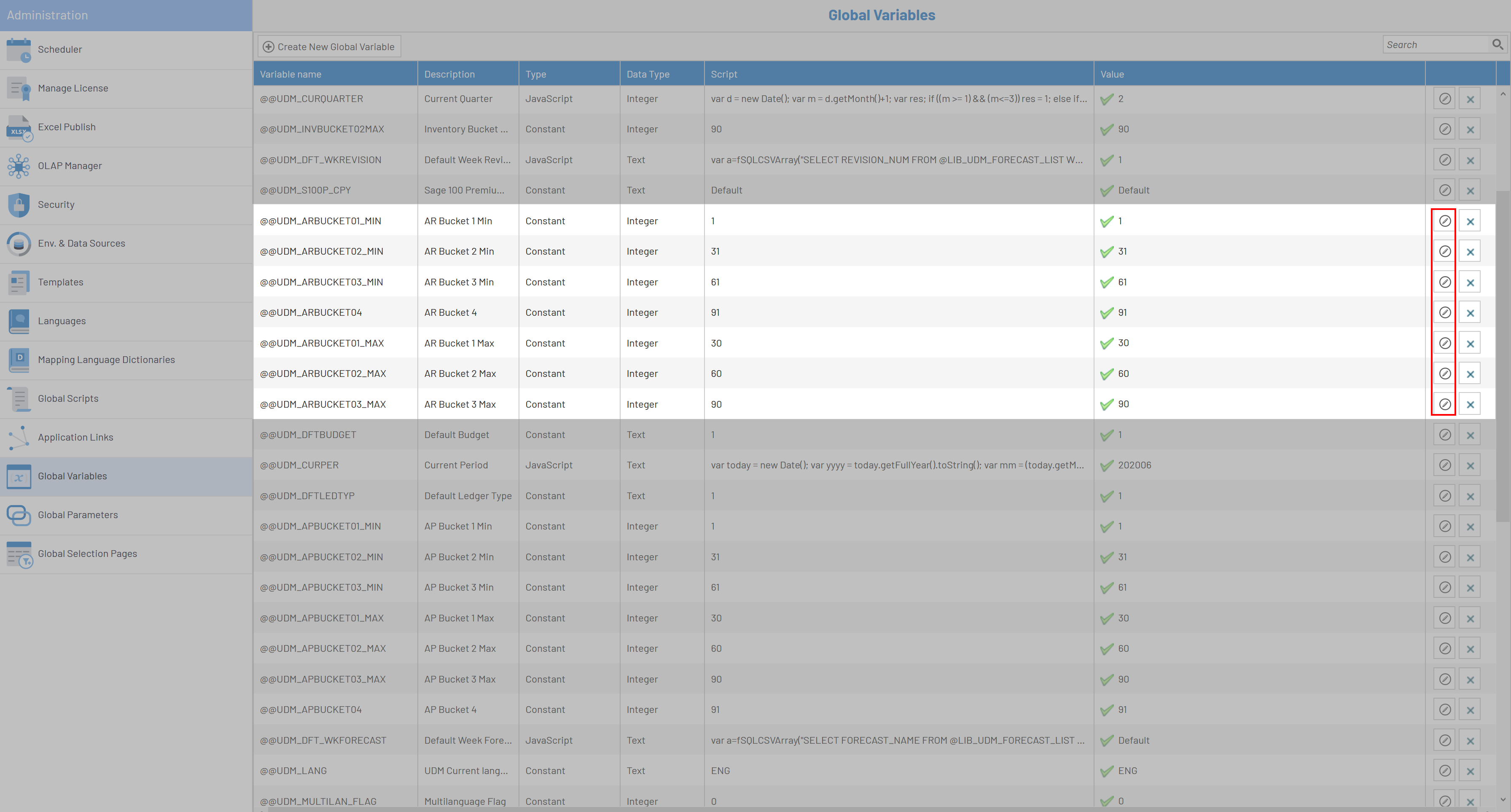 - Cliquez sur l'icône représentant un crayon pour modifier l'une des variables globales UDM_ARBUCKET.