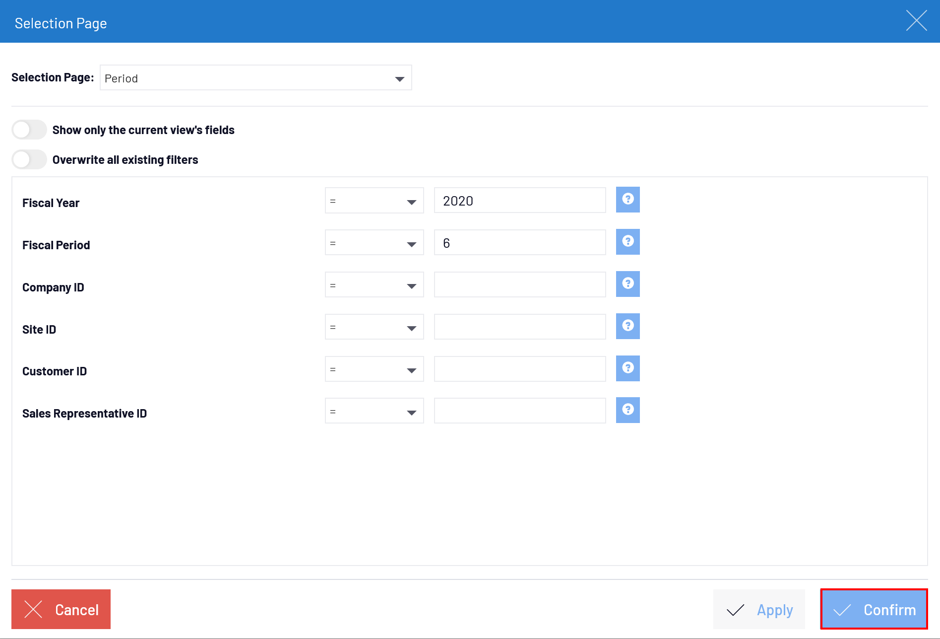 - Dans la Page de Sélection, définissez les filtres que vous souhaitez utiliser et cliquez sur Confirmer.