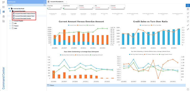 Ce tableau de bord vous donne un aperçu de l'évolution des comptes clients au cours des 12 derniers mois à partir d'une période spécifique.