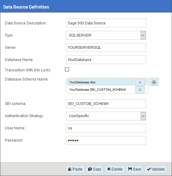 - Name of the Sage 500 database (beware of the case sensitivity)