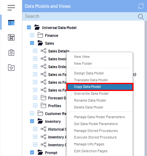 - Dans l'onglet Modèles de Données et Vues, cliquez droit sur un Modèle de Données et sélectionnez Copier le modèle de données.