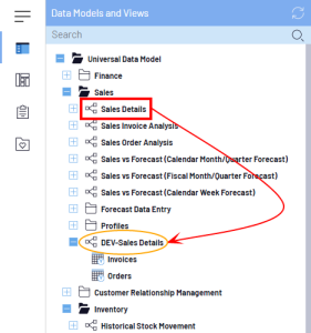 Ici, nous avons copié le Modèle de Données appelé Sales Details et l'avons renommé avec la mention DEV.