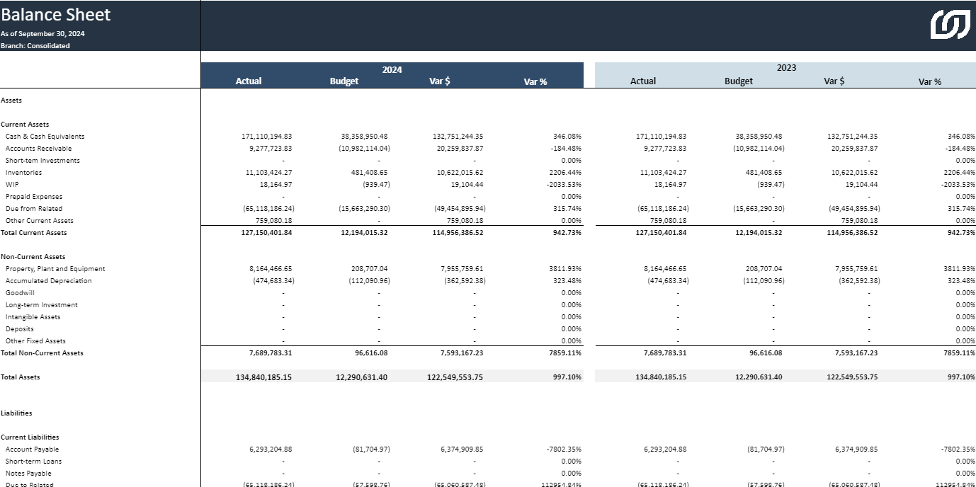 Var %: This column shows the percentage variance between the actual and budgeted balance for each account, calculated as (Var $ / Budget) * 100