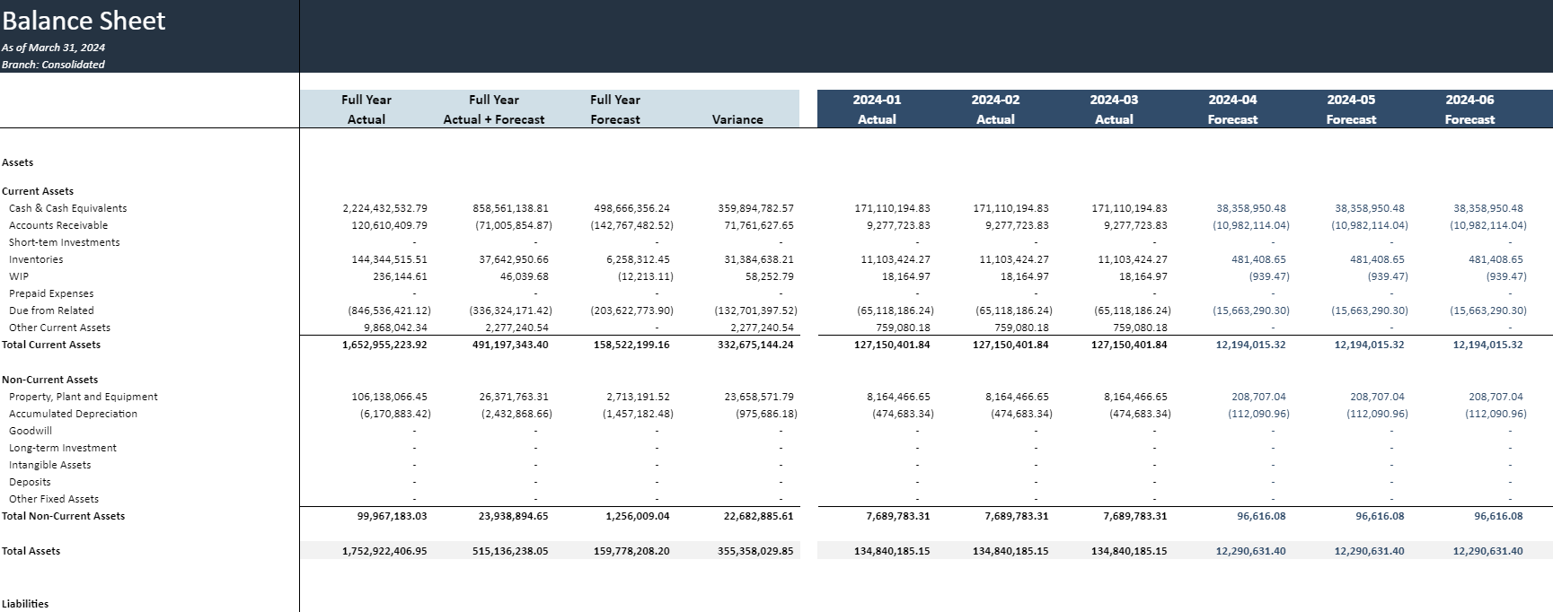 Balance Sheet Statement for the full fiscal year (By month) including actuals and forecast.