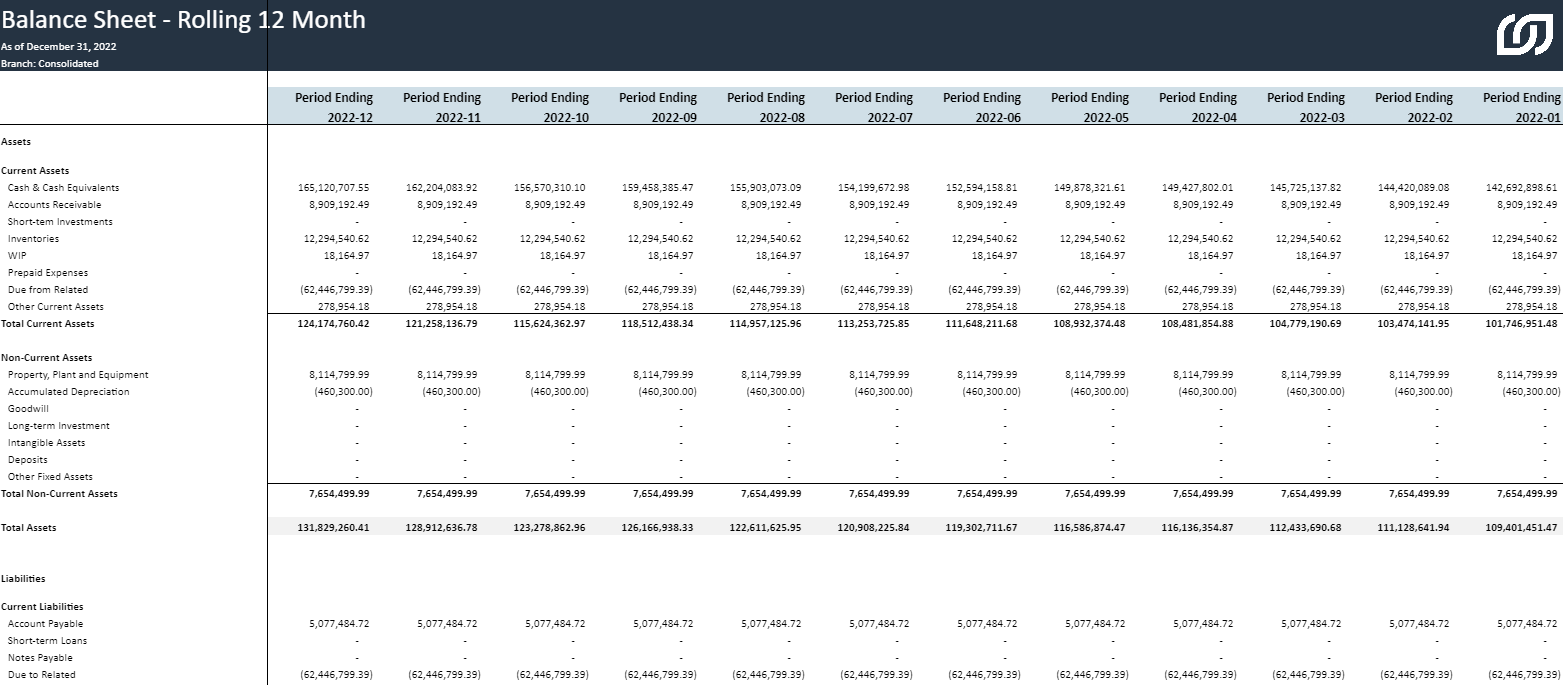 Balance Sheet Statement for the last 12 month (from selected period) showcasing the ending balance of each account, also known as Trailing 12 months (TTM).