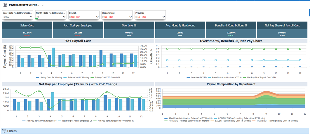 This dashboard presents strategic metrics with detailed year-on-year comparisons and dynamic filters, helping leadership manage payroll costs efficiently while aligning with workforce goals.