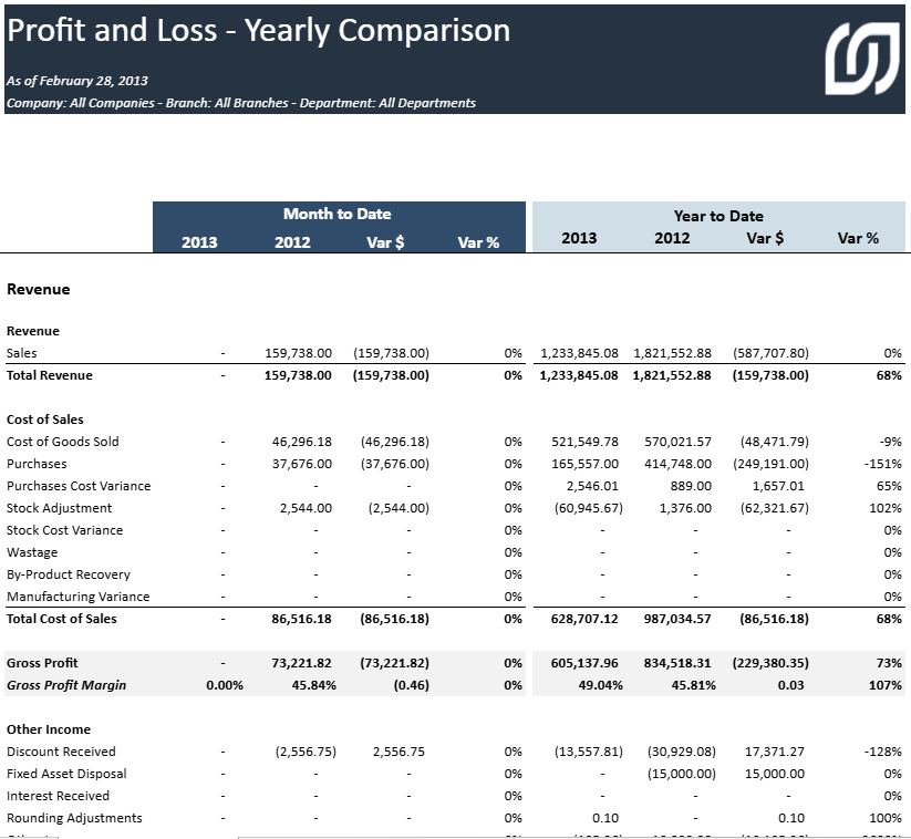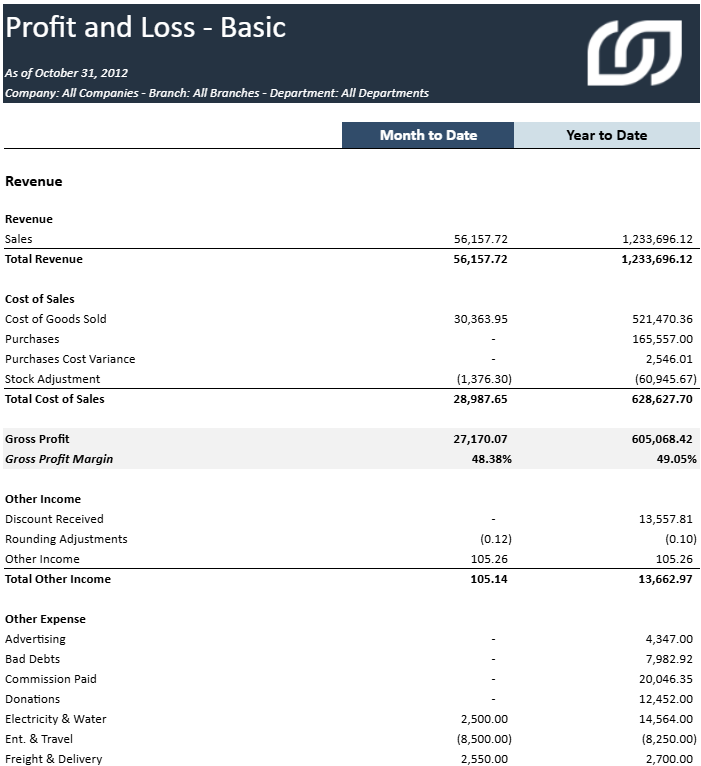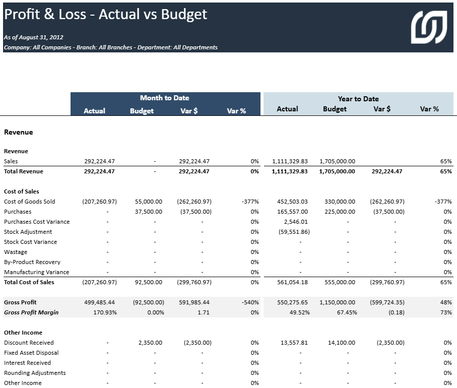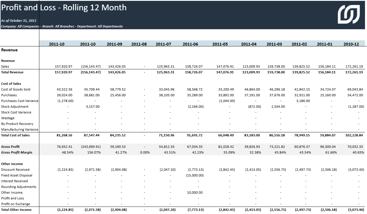 Tous les rapports de la section Profit & Perte ont la même structure de rapport qui peut être personnalisée sur la base du Type de compte de Sage 200 Evolution.