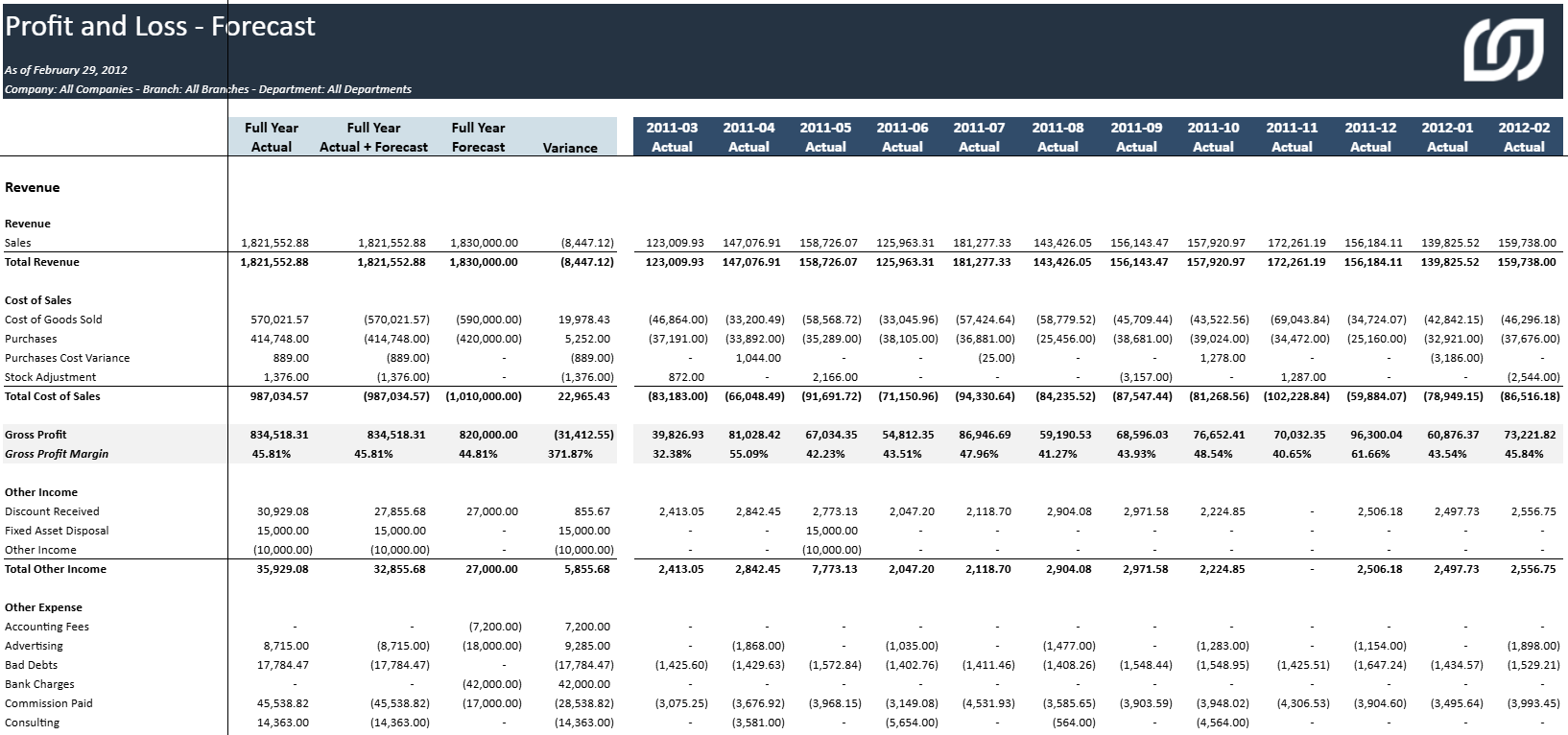 Compte de résultat pour l'ensemble de l'exercice fiscal (par mois), y compris les chiffres réels et les prévisions.