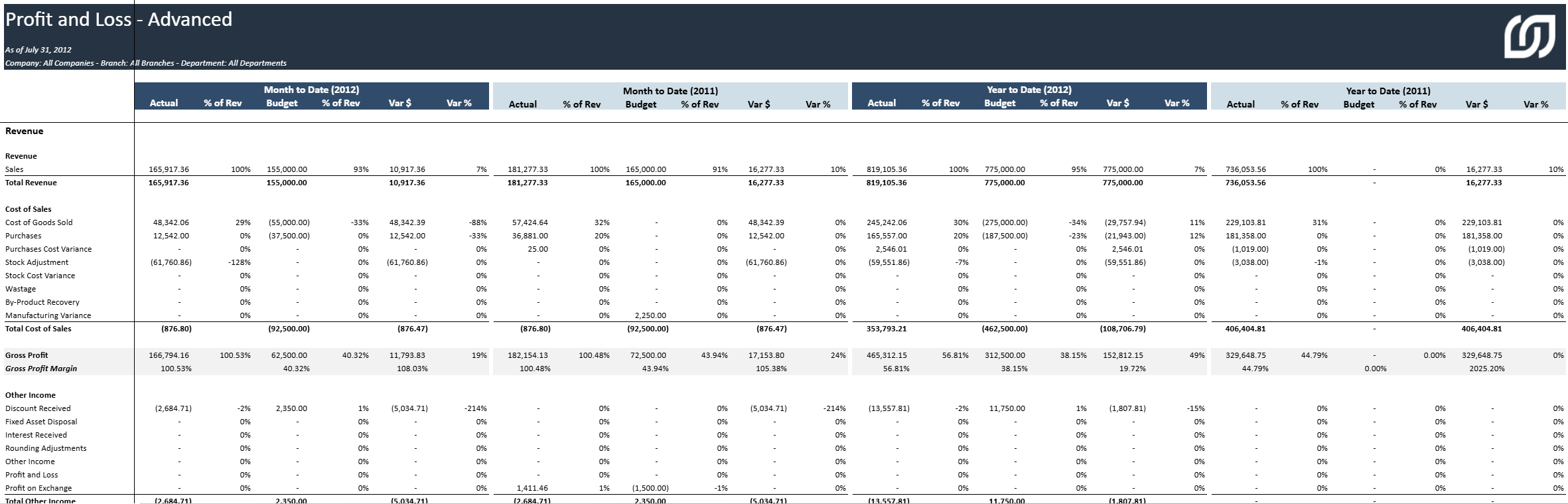 Ce rapport est un compte de résultat avec des indicateurs clés de performance plus avancés, notamment le pourcentage des recettes, le budget et les écarts pour l'année en cours et l'année précédente.