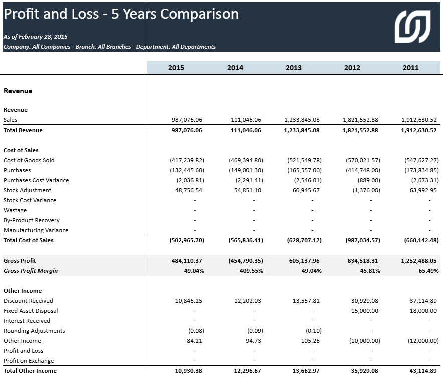 Profit et perte - Comparaison sur 5 ans