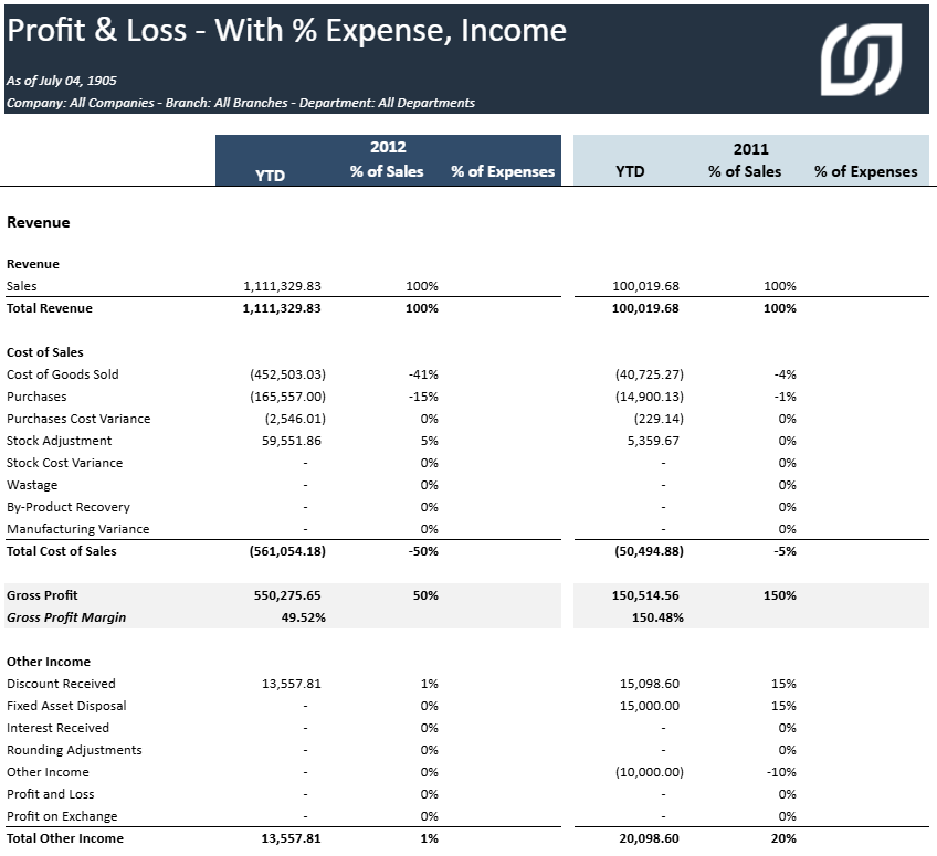 Profit and Loss - Avec % de dépenses, de revenus
